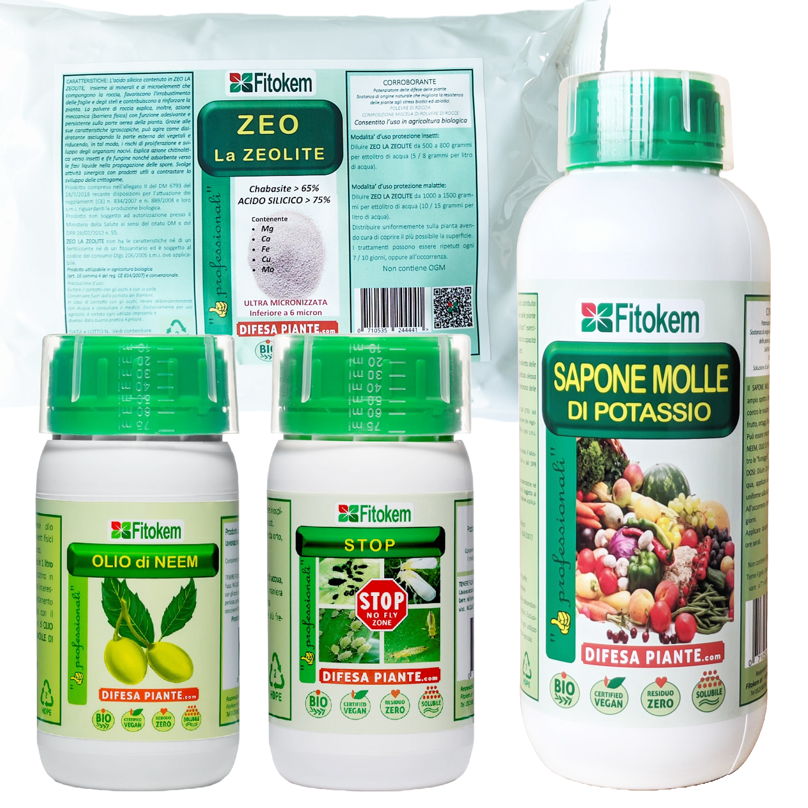 Bundle per la protezione dagli insetti più tenaci e difficili da cacciare dalle nostre piante e coltivazioni, utilizzando: Olio di Neem, Stop, Sapone Molle e Zeolite